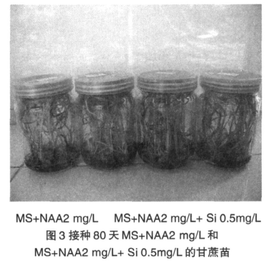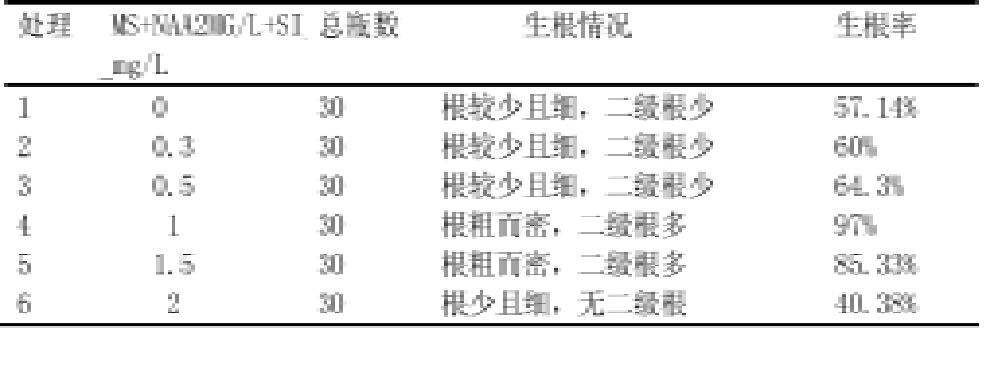 按生根情況來看,以MS+NAA 2mg/L+Si1mg/L的生根最好,具體情況如下表