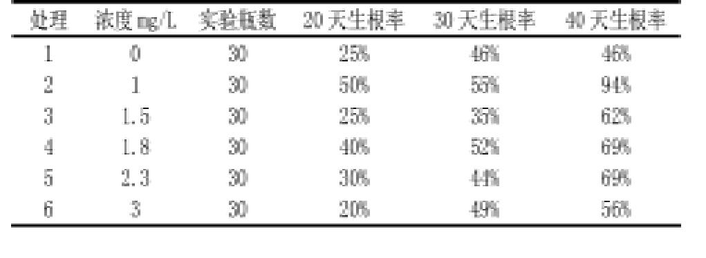 從表2可以看出IAA對甘蔗生根有一定的影響,隨著IAA濃度的增加,甘蔗的生根效果越來越好,到2mg/L時生根最好:根濃而密,較粗壯;苗墨綠;黃葉基本沒有。以后隨著IAA濃度的增加,甘蔗的生根效果越來越差。