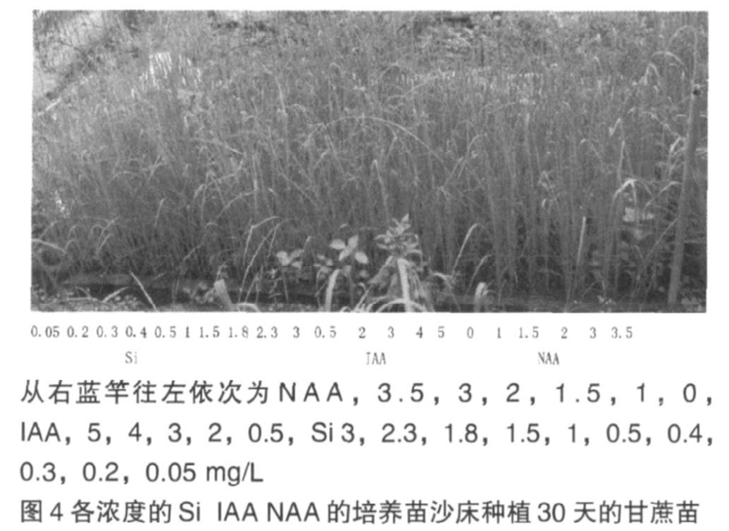 比較硅和NAA的甘蔗苗,發現各濃度的硅都對甘蔗苗的保綠效果明顯,明顯高于各濃度NAA的培養基的甘蔗苗,在培養基中加入硅的甘蔗苗明顯地黃花少,長勢好,而其中只加入NAA的明顯地黃花多,長勢弱,差別非常明顯。其中以加入0.4-0.5mg/L的硅保綠效果最好;比較各濃度的IAA和NAA甘蔗苗,發現IAA仍有部分的保綠效果,但沒硅明顯。
